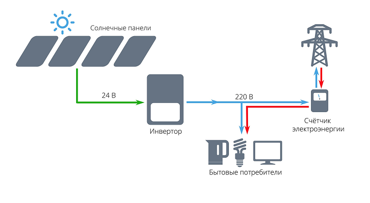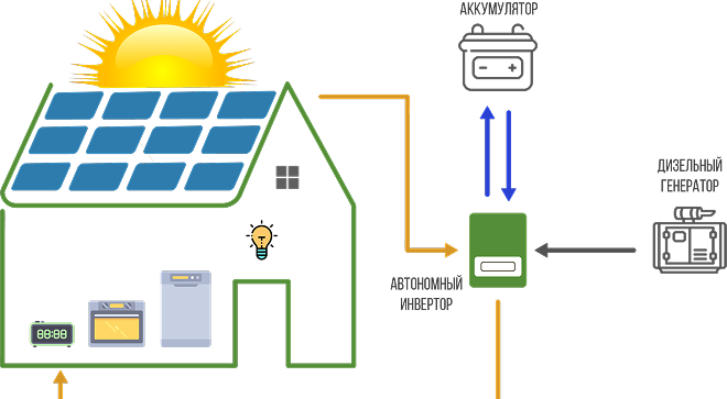 Күндізгі уақытта күн панельдері энергияны өндіреді, ол бірінші кезекте тұтынушыларды (үй, бизнес, кәсіпорын) қуаттандыруға пайдаланылады.